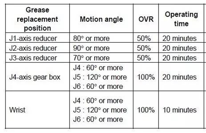 1. 當(dāng)正常使用的機(jī)器人運(yùn)行時間達(dá)到1萬小時或使用3年時需要更換本體減速機(jī)內(nèi)部潤滑油,根據(jù)機(jī)器人實(shí)際使用環(huán)境適當(dāng)縮短保養(yǎng)間隔周期。