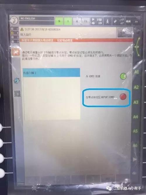 step 1:T1模式,無選擇程序,程序啟動鍵正常,機(jī)器人各軸到達(dá)零點(diǎn)附近位置;