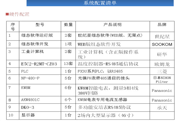 系統(tǒng)說明 l1.RS485總線來采集設(shè)備的各種參數(shù)。通過PLC與設(shè)備上的溫控表、PH值表、傳感器等以通信、 l2.使用工控組態(tài)軟件來存儲記錄PLC中采集的各種設(shè)備參數(shù)。 l3.使用KW8M 采集電流、電壓數(shù)據(jù)通過RS485通信。 l4.世紀(jì)星監(jiān)控系統(tǒng)控制策略的創(chuàng)建是在策略編輯器中實現(xiàn)的,策略編輯器是一個基于圖標(biāo),即功能模塊的設(shè)計環(huán)境.結(jié)合策略工具箱中的功能模塊及其相應(yīng)的參數(shù)配置對話框開發(fā)策略與配置工作.通過RS485總線通信采集數(shù)據(jù)連接功能塊。功能模塊也稱為軟儀表,其功能與人們熟悉的模擬儀表相同,能完成現(xiàn)場數(shù)據(jù)的采集、處理、顯示、報警和控制等(如溫度、電流、電壓、PH值、I/O狀態(tài)).構(gòu)建控制策略時,用連線將策略所需的功能模塊連接起來. l5.采集的記錄報表數(shù)據(jù)發(fā)送到局域網(wǎng)外遠端,在遠端也能進行數(shù)據(jù)分析。